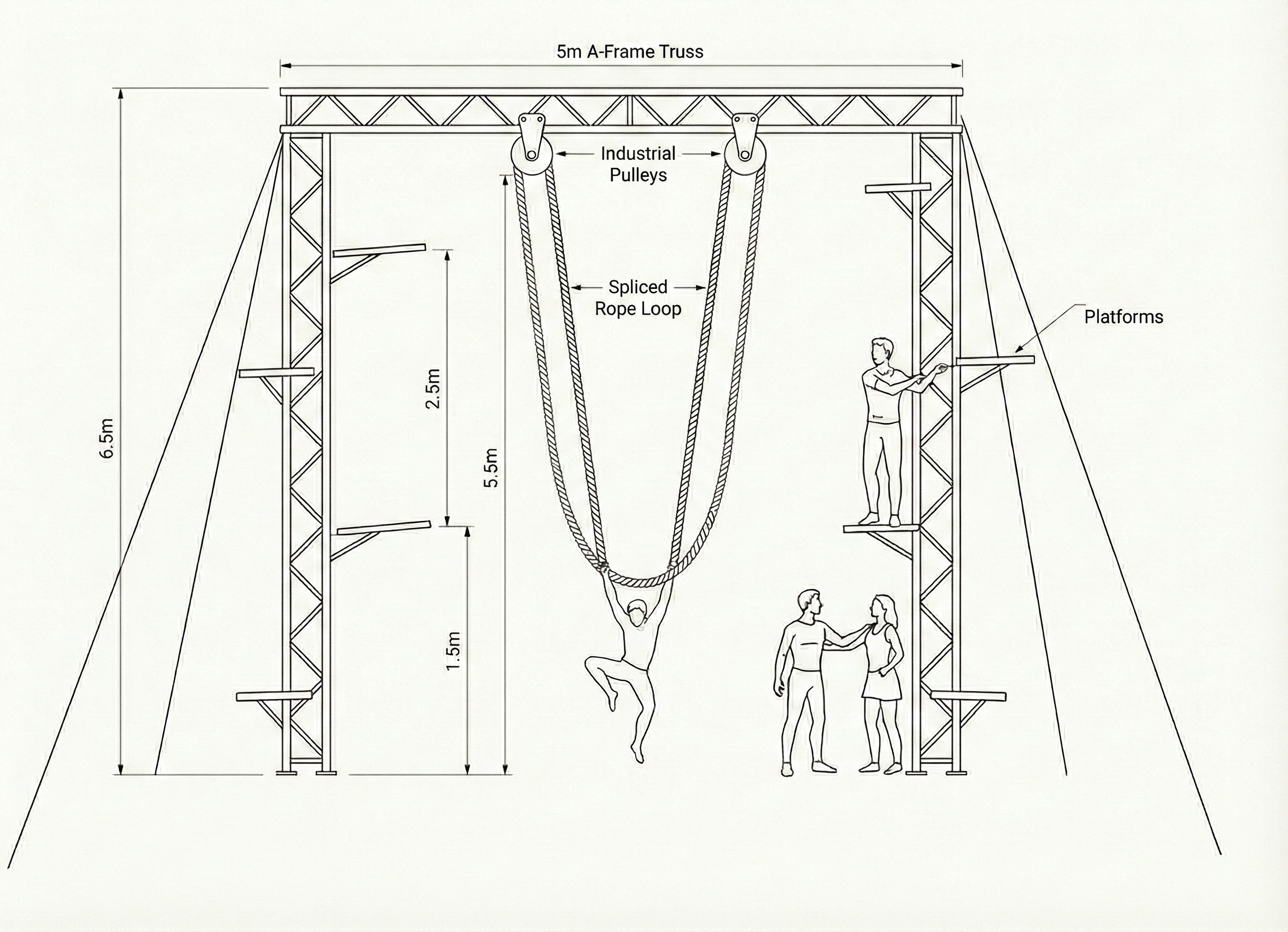 Building on our past work of designing freestanding rigs, we want to build a new, fast-assembly structure. The core idea is a continuous, endless loop of specialist rope running through giant pulleys. Instead of a normal aerial setup where the rope is tied to the ground, the aerialist's dynamic movement is completely dependant on other performers or even audience members stopping the rotation of the rope. If the people on the ground don't grip and stop the rope, the acrobat can't do their drops. They literally need the physical effort of the people next to them to make the trick work.