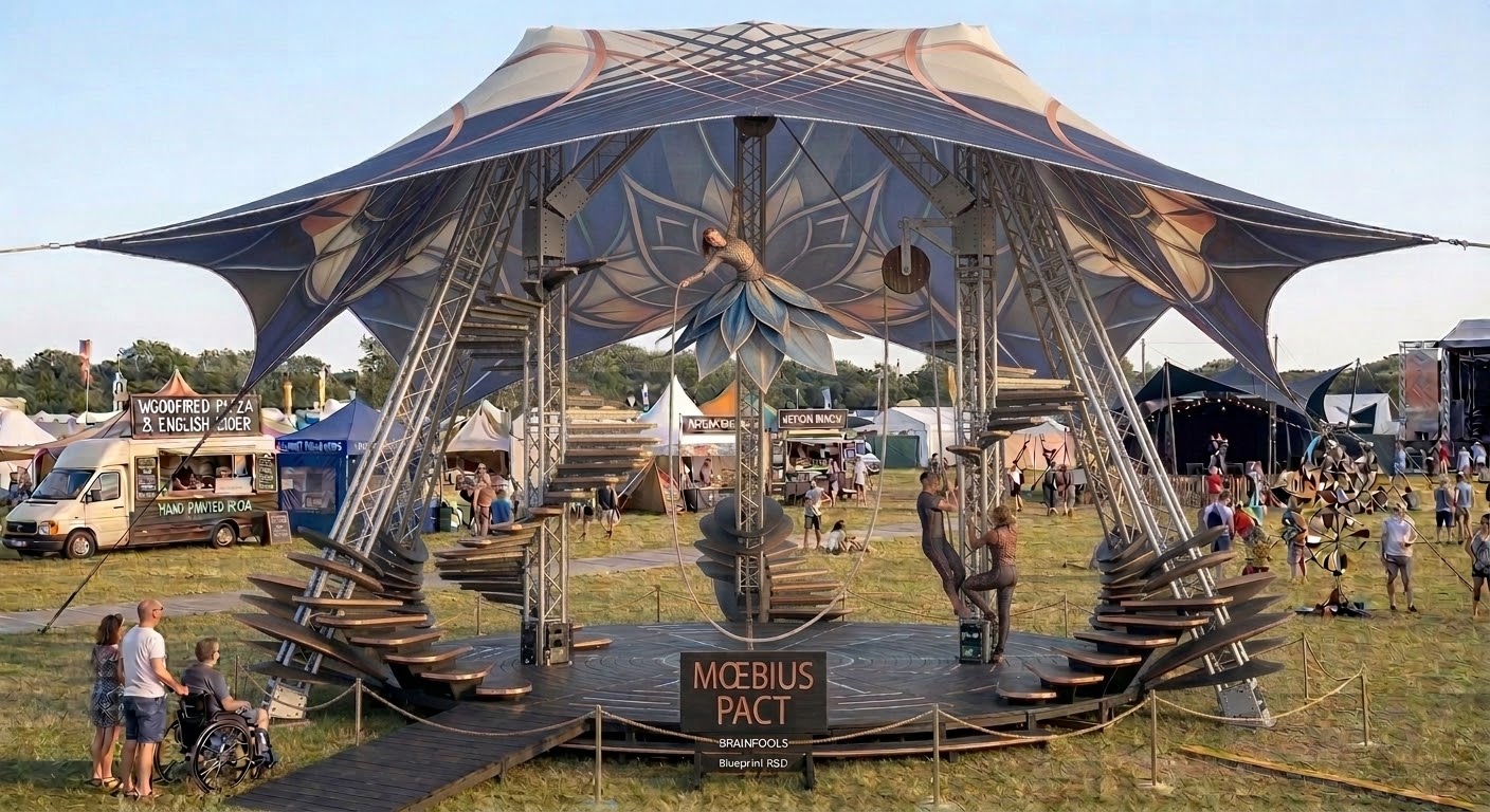 The goal of Moebius Pact is to physically show this digital isolation. We want to make an outdoor contemporary circus show and kinetic installation for festival touring. Visually, the set is inspired by the German 'Klangbaum' (Sound Tree) toys we saw growing up. It will stand in a festival field as a tall, freestanding wooden and metal sculpture. It looks beautiful on its own, but it only really comes alive when the public interacts with it.